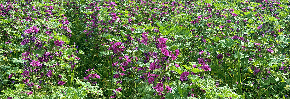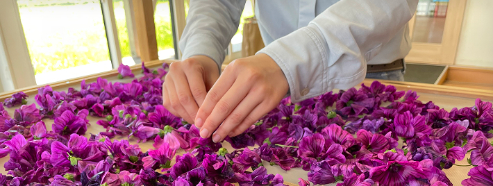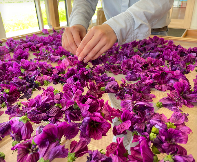 夏になると、鮮やかなマゼンタ色の花を咲かせるゼニアオイ。薄くやわらかな花びらは繊細で、満開の収穫期には、花弁を傷つけないよう、ひとつひとつやさしく手摘みしています。